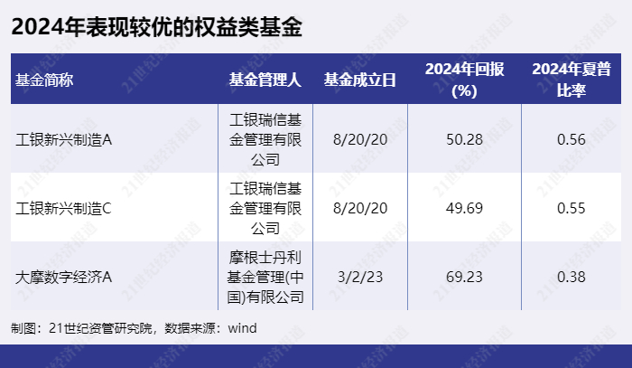 综合表现不错(收益率前十中夏普比率较高者)的权益类基金有“工银新兴制造A”、“工银新兴制造C”、“大摩数字经济A”等。