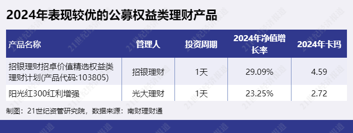 4、权益类产品表现方面,2024年综合表现不错(收益率前十中卡玛比率较高者)的权益类理财产品有“招银理财招卓价值精选权益类理财计划、“阳光红300红利增强”等。