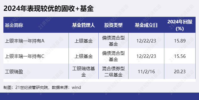 3、“固收+”产品表现方面,2024年综合表现较佳(收益率前十中夏普比率较高者)的“固收+”基金有“上银丰瑞一年持有A”、“上银丰瑞一年持有C”、“工银瑞盈”等。
