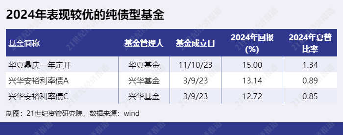 2、纯债型产品方面,收益高的纯债型公募基金青睐通过拉长久期、加杠杆等方式提高收益率, 部分纯债型集合理财产品则通过适当信用下沉提高收益。2024年回报居前的纯债型基金中兼具性价比(收益率前十中夏普比率较高)的有“华夏鼎庆一年定开”、“兴华安裕利率债A”、“兴华安裕利率债C”等。