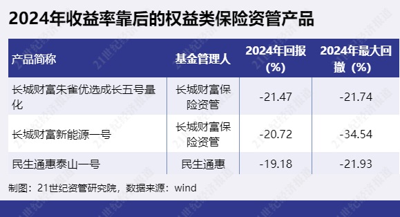2024年收益率靠后的权益类保险资管产品为“长城财富朱雀优选成长五号量化”、“长城财富新能源一号”、“民生通惠泰山一号”等。