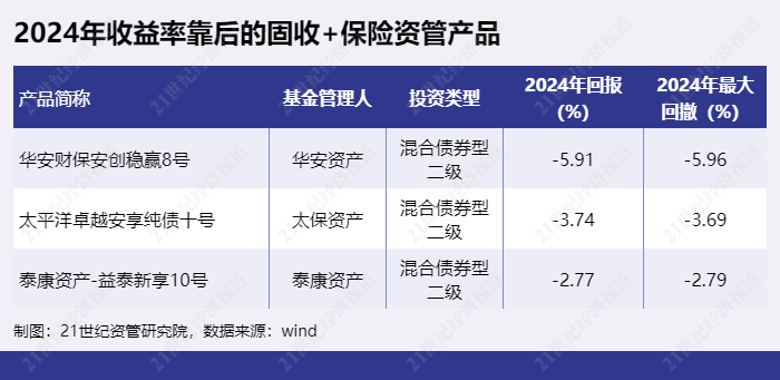 2024年收益率靠后的“固收+”保险资管产品为“华安财保安创稳赢8号”、“太平洋卓越安享纯债十号”、“泰康资产-益泰新享10号”等。