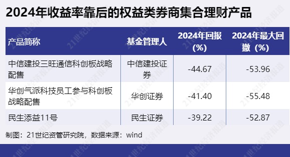 2024年收益率靠后的权益类券商集合理财产品为“中信建投(601066)三旺通信科创板战略配售”、“华创气派科技员工参与科创板战略配售”、“民生添益11号”等。