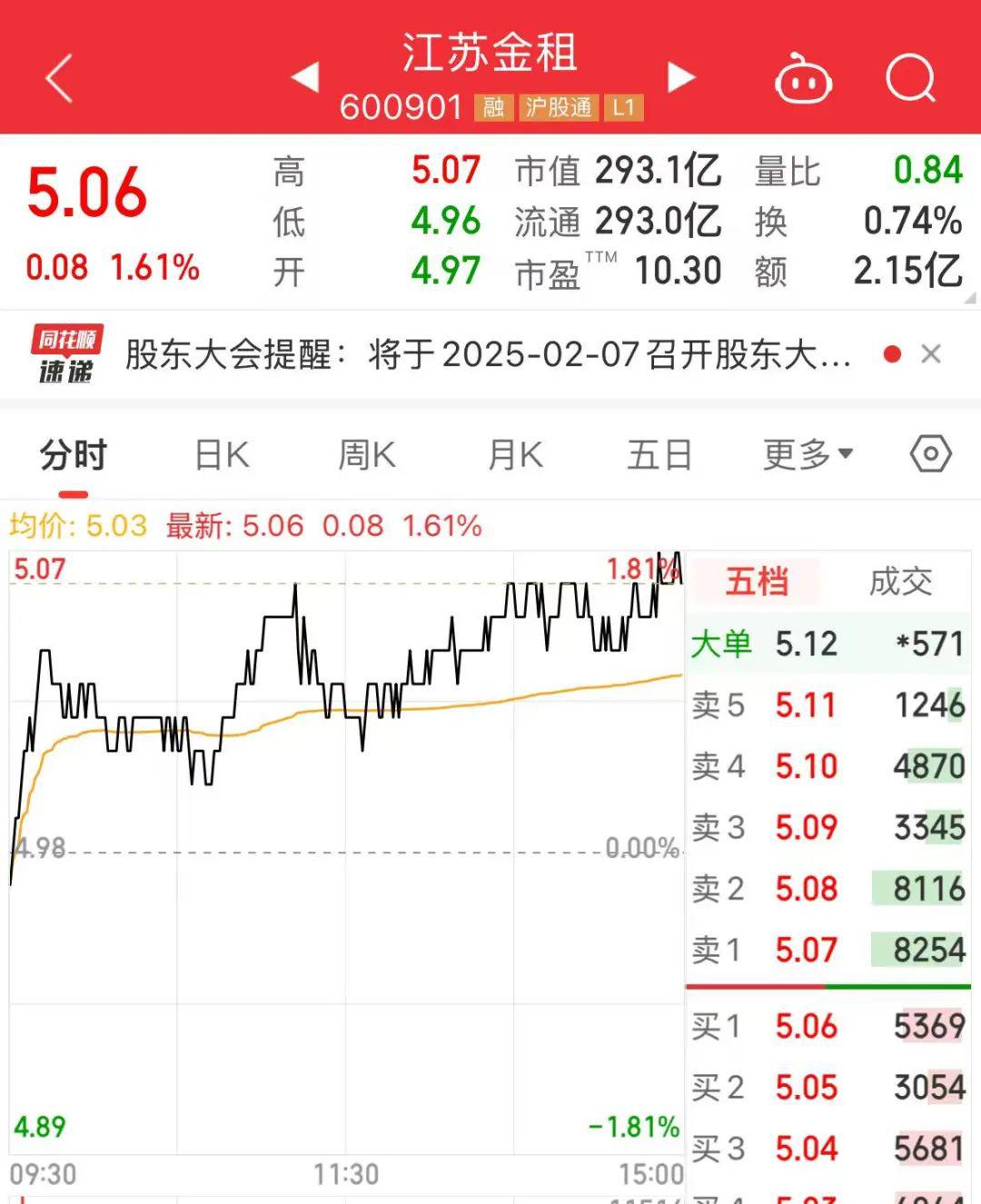 1月14日收盘,江苏金租股价报5.06元,涨幅为1.61%,总市值为293亿元。
