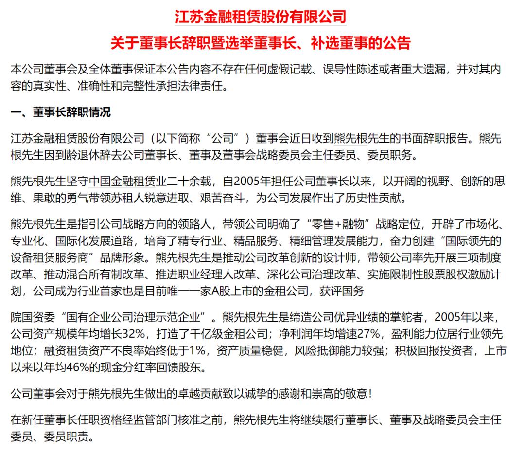 【导读】“金租第一股”江苏金租董事长熊先根到龄退休!