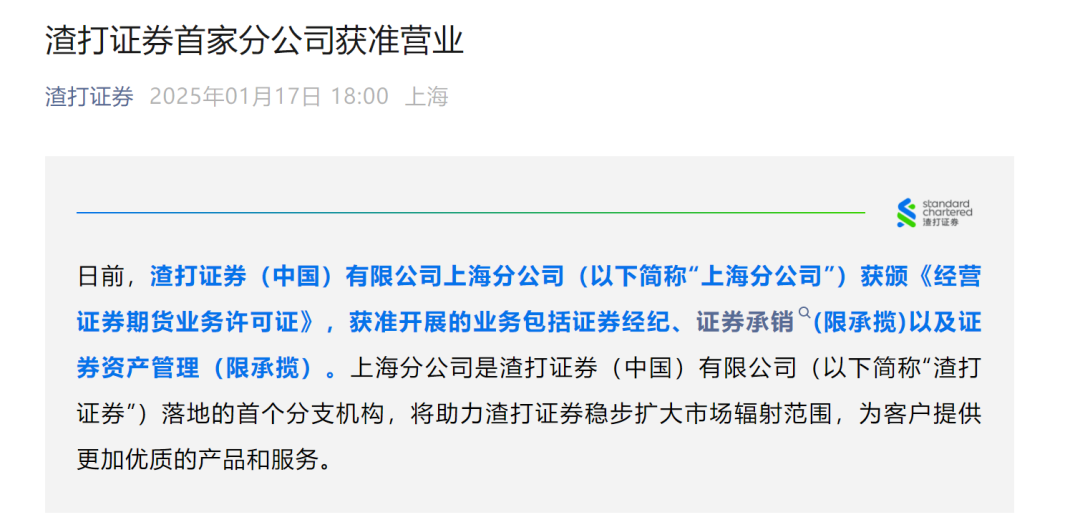 渣打证券(中国)上海分公司获批