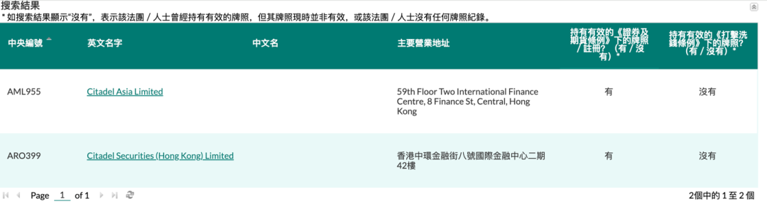 来自香港证监会网站披露信息显示,Citadel Asia Limited和Citadel Securities(Hong Kong)Limited在香港持有证券交易、期货交易和资产管理等牌照。