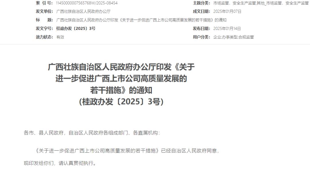 1月7日,广西壮族自治区人民政府办公厅印发《关于进一步促进广西上市公司高质量发展的若干措施》,以期全面提升广西上市公司的治理能力、竞争能力、创新能力、抗风险能力和回报能力,显著增强对广西经济高质量发展的引领带动作用。