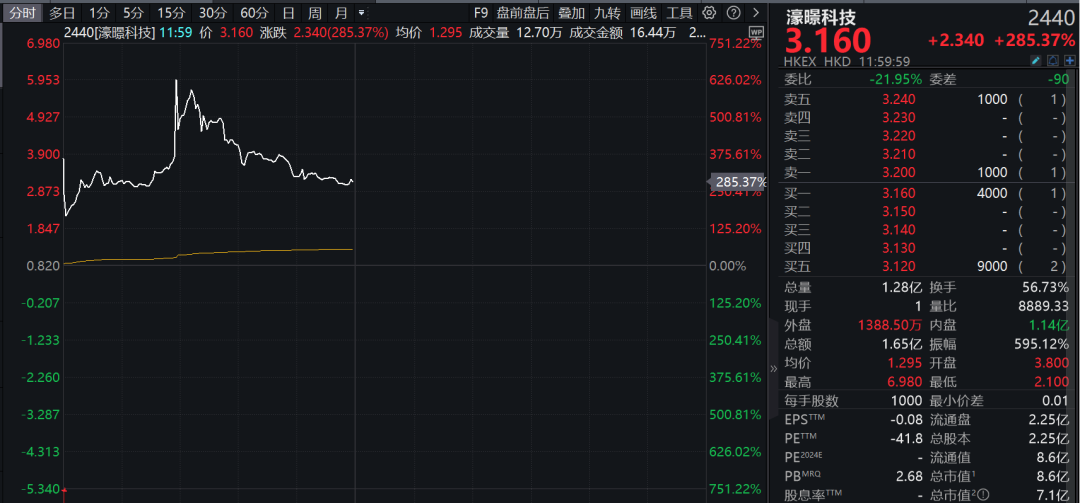 港股濠暻科技早间大幅高开高走,股价盘中最高一度飙涨逾751%,后涨幅虽有所回落,但截至发稿仍大涨285%,成交超1.6亿港元,换手率超56%。