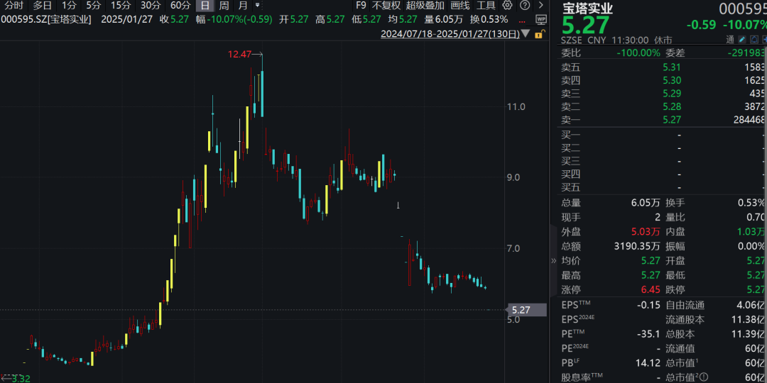 宝塔实业今日公告,经公司财务部门初步测算,预计公司2024年度利润总额、净利润、扣除非经常性损益后的净利润为负值,且扣除后的营业收入低于3亿元,根据《深圳证券交易所股票上市规则(2024年修订)》第9.3.1条规定,在公司2024年度报告披露后,公司股票可能被实施退市风险警示(股票简称前冠以“*ST”字样),敬请广大投资者注意投资风险。宝塔实业早间开盘一字跌停。