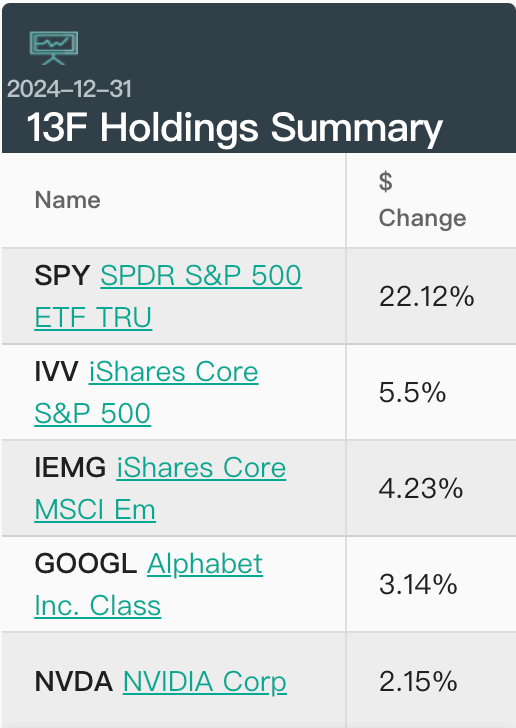 截至2024年底,桥水的前五大持仓分别为:SPY(标普500ETF-SPDR)、IVV(标普500ETF-iShares)、IEMG(核心MSCI新兴市场ETF-iShares)、谷歌A、英伟达。
