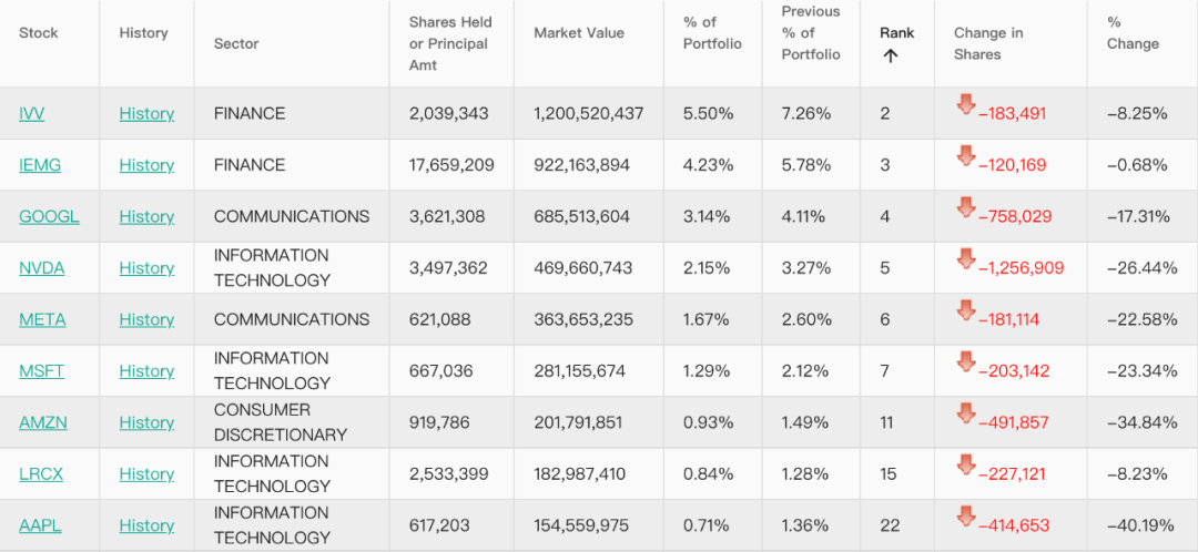 同时,桥水还减持了IVV(标普500ETF-iShares)18.3万份,减持IEMG(核心MSCI新兴市场ETF-iShares)12万份。