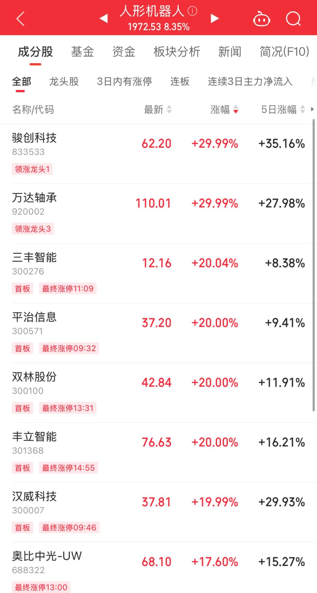 今天,人形机器人热度居高不下,截至收盘,板块大涨超8%,骏创科技、三丰智能(300276)等多股涨停,多只个股创历史新高或阶段新高。杭齿前进走出6连板,该股2月以来累涨超81%。