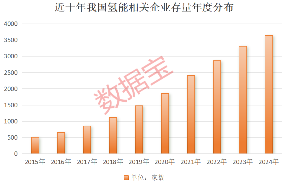 在政策催化下,资本和技术加速渗透产业。根据企查查数据显示,近十年,我国氢能相关企业存量逐年稳步增加,并分别于2021年、2023年首次突破2000家、3000家;截至2024年末氢能相关企业存量达3648家,创近十年相关企业存量新高。截至2月18日,我国现存3662家氢能相关企业。