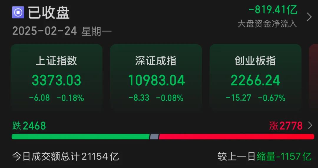 2月24日,市场全天震荡调整,全市场成交额为21154亿元。盘面上,市场热点较为杂乱,个股涨多跌少,全市场超2700只个股上涨。板块方面,机场航空、工程机械(881268)、农业、国资云(885977)等板块涨幅居前。截至收盘,沪指(1A0001)跌0.18%,深成指(399001)跌0.08%,创业板指(399006)跌0.67%。