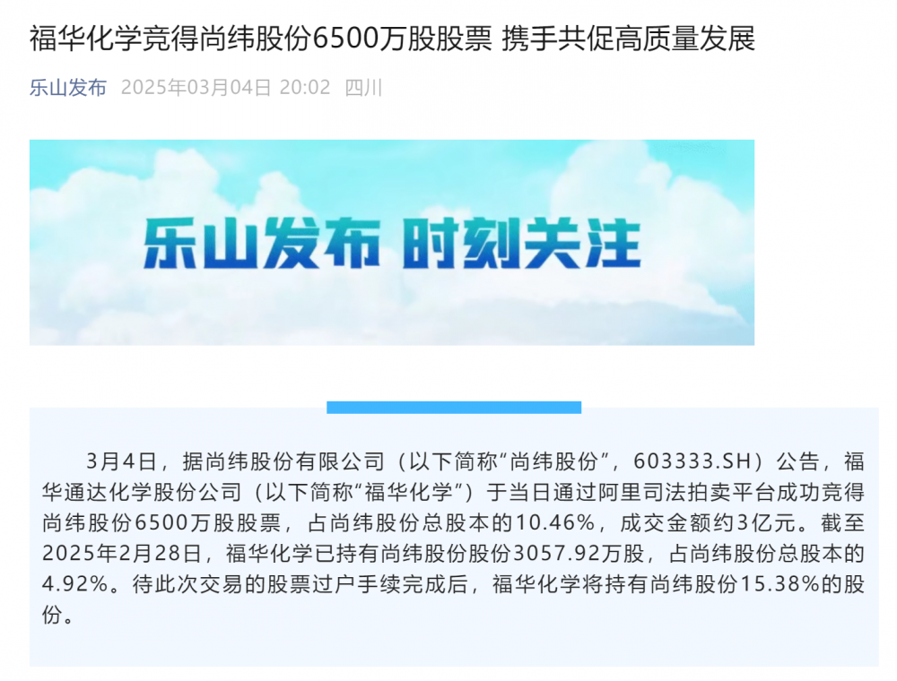 3月4日10时,尚纬股份6500万股的股份拍卖正式落槌,全球草甘膦龙头乐山福华通达化学股份公司(下称“福华化学”)以3亿元的价格成功竞得。