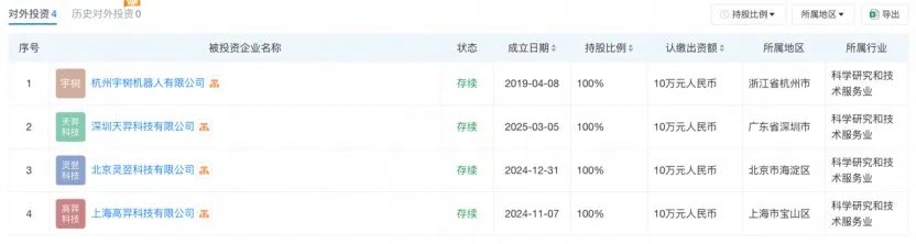 作为总部位于杭州的公司,宇树科技并非首次在其他城市设立子公司。天眼查显示,除杭州以外,宇树科技还在北京、上海、深圳对外投资了三家公司,分别是北京灵翌科技有限公司、上海高羿科技有限公司和深圳天羿科技有限公司。随着深圳子公司的设立,宇树科技在北、上、深三座超一线城市均已有所布局。