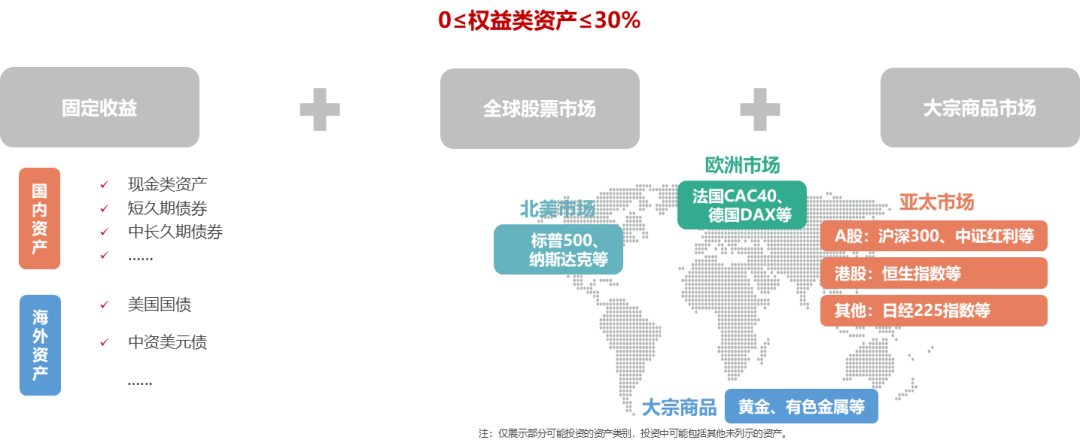 首先,该基金基于宏观经济和市场微观表现等指标,进行大类资产配置,确定固收资产、商品资产和全球权益资产的比例;其次,在具体的资产类别中深入挖掘结构性投资机会,捕捉市场潜在收益。