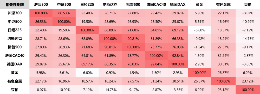 统计数据显示,自2005年以来,A股市场与全球市场的平均相关系数(月度收益)仅18.56%。长期来看,全球权益资产之间的相关性较低,分散配置价值较为显著。因此,若在资产组合中加入一定比例的海外权益资产和黄金等大宗商品资产,将对组合的波动控制和收益起到比较明显的正向作用。