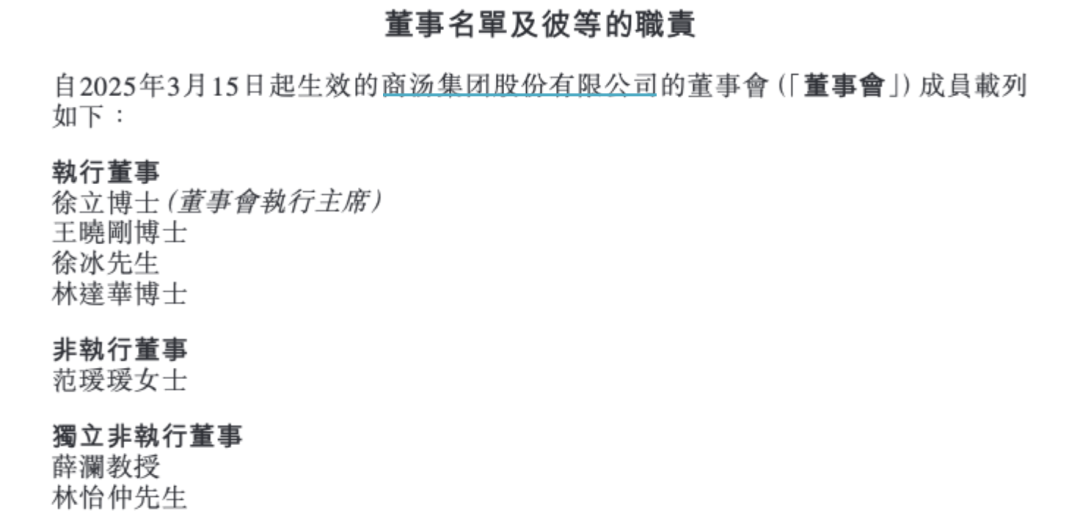 公司同日发布的《董事名单及彼等的职责》显示,公司执行董事包括徐立、王晓刚、徐冰、林达华。