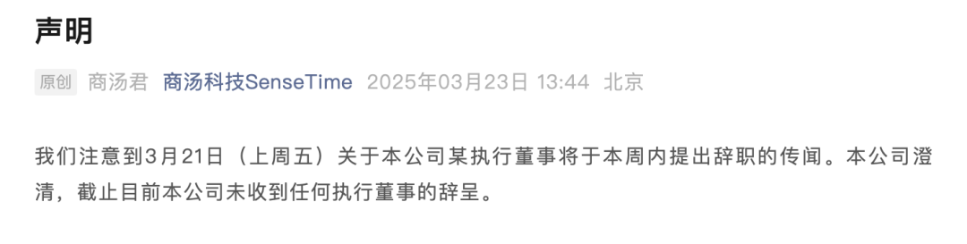 3月23日中午,商汤科技官方微信公众号发布声明称,“我们注意到3月21日关于本公司某执行董事将于本周内提出辞职的传闻。本公司澄清,截至目前本公司未收到任何执行董事的辞呈。”