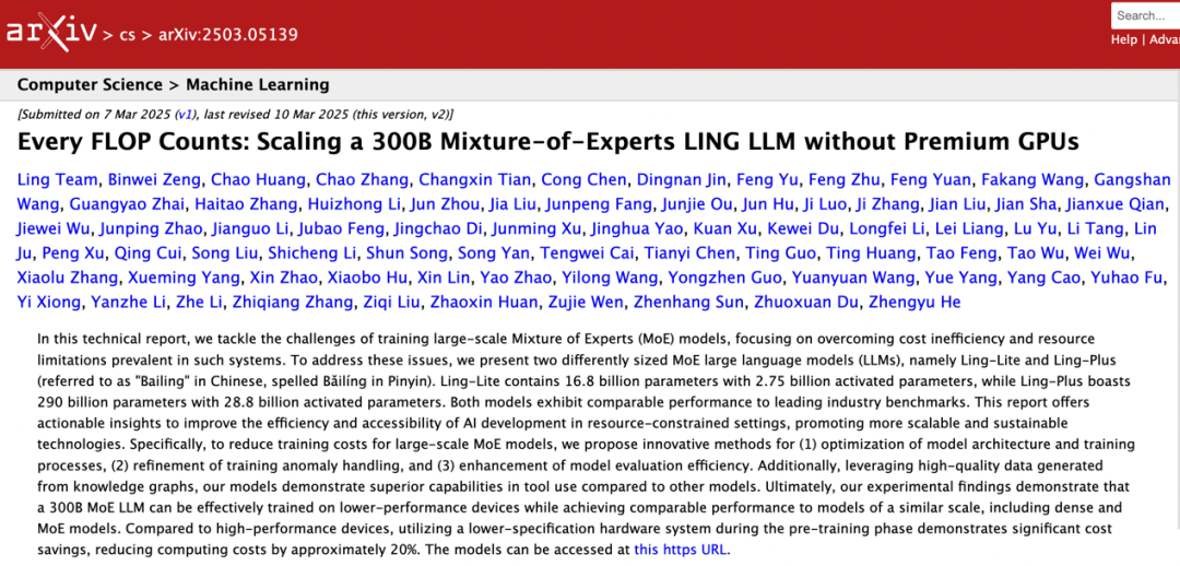 目前,蚂蚁集团Ling团队的技术成果论文《每一个FLOP都至关重要:无需高级GPU即可扩展3000亿参数混合专家LING大模型》已发表在预印版Arxiv平台上。