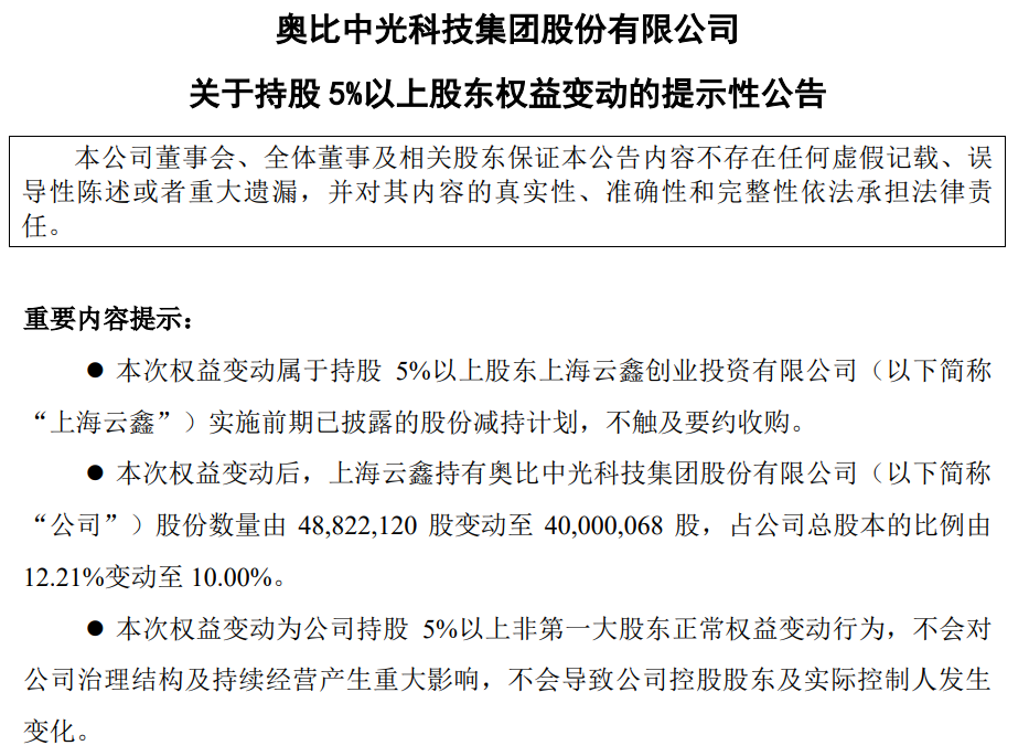 近日,奥比中光发布公告显示,蚂蚁集团旗下上海云鑫投资管理有限公司在2025年1月10日至3月14日期间,通过集中竞价及大宗交易减持奥比中光882.2万股(占总股本的2.21%),套现约5.56亿元。减持后,蚂蚁仍持有10%股份,居第二大股东。