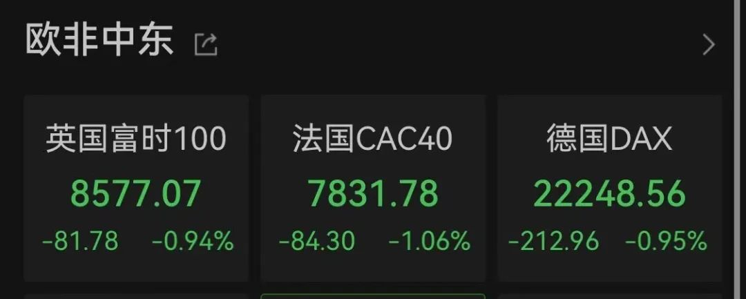 今日,外围市场大跌,日经225指数重挫逾4%,韩国综合指数也大跌超3%,下午欧洲市场开盘,英国富时100、法国CAC40、德国DAX等指数均低开下跌超1%。