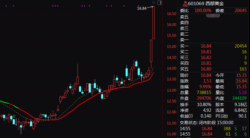 市场热点方面,黄金概念股今日继续强势上攻,板块指数逆势放量大涨逾2%。西部黄金(601069)尾盘直线拉升涨停,连续第2日封板块,股价创3年多来新高,特力A(000025)、宁波中百(600857)亦逆势涨停。