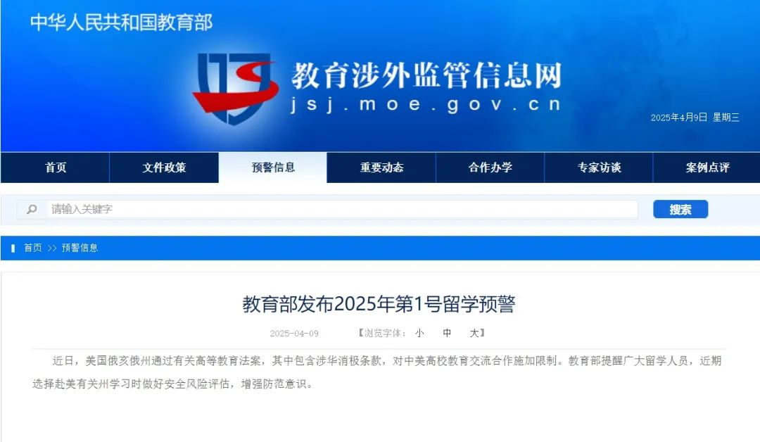 教育部发布2025年第1号留学预警。近日,美国俄亥俄州通过有关高等教育法案,其中包含涉华消极条款,对中美高校教育交流合作施加限制。教育部提醒广大留学人员,近期选择赴美有关州学习时做好安全风险评估,增强防范意识。