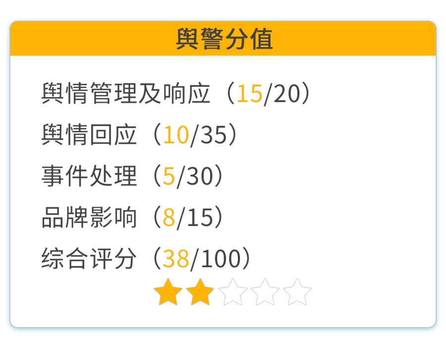 舆警分值:舆情管理及响应(15/20)舆情回应(10/35)事件处理(5/30)品牌影响(8/15)综合评分(38/100)
