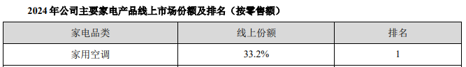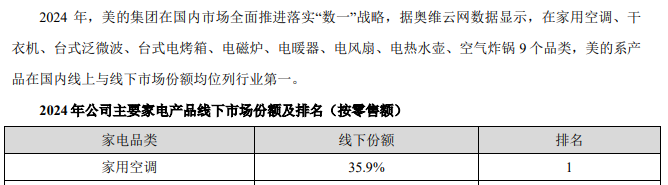根据美的集团引用的数据,2024年,其家用空调的线下市场份额为35.9%,排名第一;家用空调的线上市场份额为33.2%,排名第一。