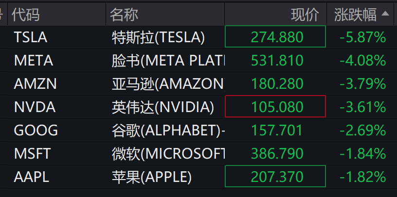 美国科技七巨头全线下跌,特拉斯跌近6%。