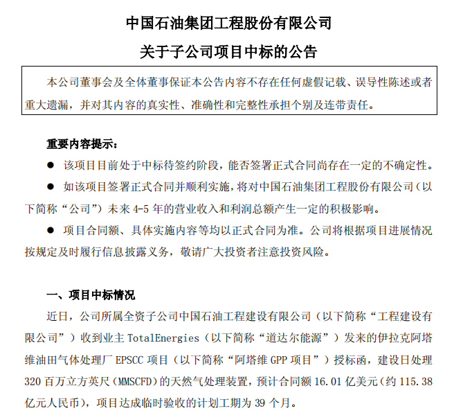 5月14日晚间,中油工程(证券代码:600339)发布公告称,公司全资子公司中国石油工程建设有限公司收到TotalEnergies(以下简称道达尔能源)发来的伊拉克阿塔维油田气体处理厂EPSCC项目(以下简称阿塔维GPP项目)授标函,内容为建设日处理320百万立方英尺(MMSCFD)的天然气处理装置,预计合同额为16.01亿美元(约合人民币115.38亿元)。