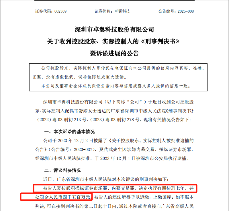 4月12日,卓翼科技发布公告称,夏传武因犯操纵证券市场罪、内幕交易罪,被深圳市中级人民法院一审判处有期徒刑七年,并处罚金4500万元。对夏传武的违法所得予以追缴,上缴国库。