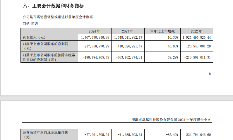 2024年,卓翼科技的营业收入为17.07亿元,同比增长10.30%;归母净利润为-2.18亿元,同比增长46.93%。