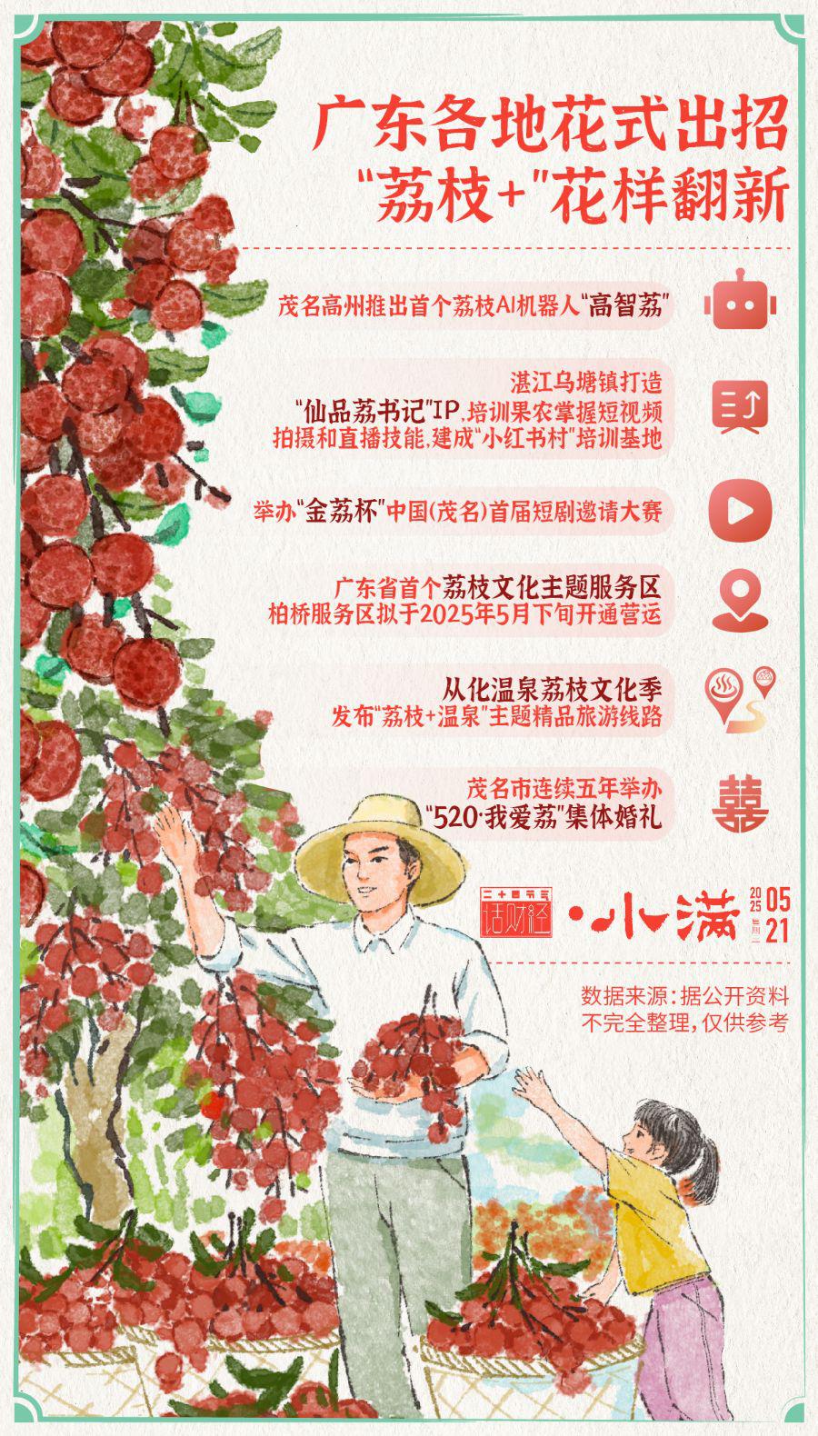 依托“百千万工程”及农产品“12221”市场营销体系建设的不断推进,广东荔枝的产业链正在从精深加工向多样化品牌营销、特色主题旅游产品、IP短剧等方向延伸。“荔枝书记”IP、“定制认养计划”、“荔枝直播节”、AI数字果园、“高智荔”AI工具……各大产区花式出招,“荔枝+”花样不断翻新,推动荔枝产业从“枝头”到 “舌尖”的全链条升级。