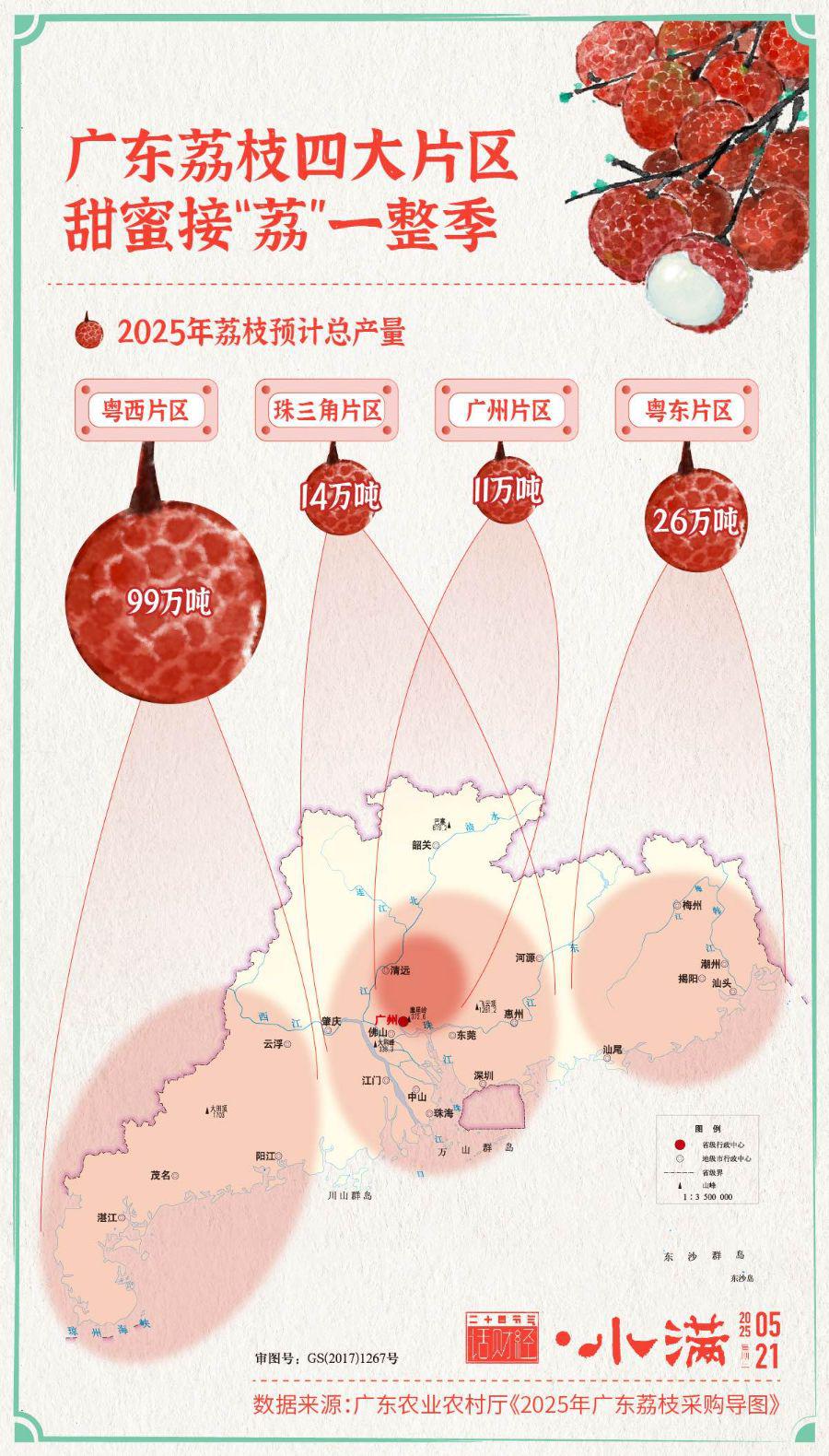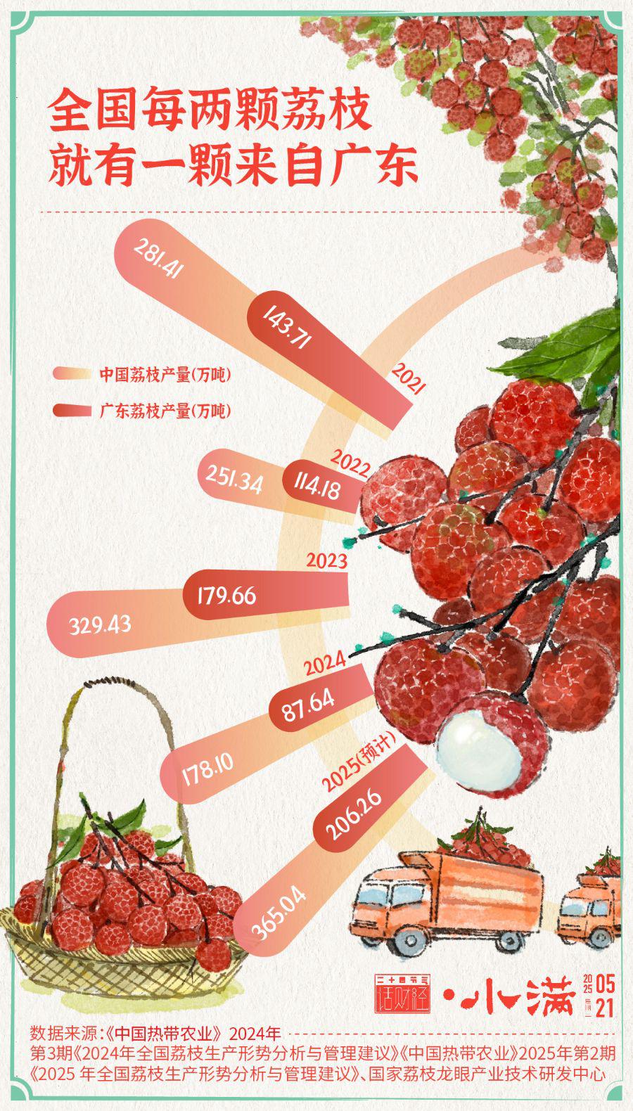 今日小满(2025年5月21日),万物渐盈,岭南荔枝也悄然缀满枝头。进入五月,广东荔枝自西向东陆续成熟,“三月红”“妃子笑”等早熟品种率先拉开荔枝季帷幕,掀起采购热潮。