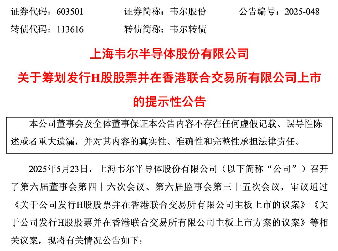 5月23日晚间,韦尔股份发布公告称,为加快公司的国际化战略及海外业务发展,增强公司的境外融资能力,进一步提高公司的综合竞争力,根据公司总体发展战略及运营需要,公司拟发行境外上市股份(H股)并在香港联交所主板上市。公司将充分考虑现有股东的利益和境内外资本市场的情况,在股东大会决议有效期内选择适当的时机和发行窗口完成本次发行。