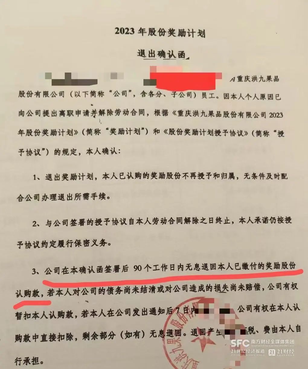 参与了员工持股的员工们,离职前签署了一份有洪九果品公司盖章的退股协议。这份名为《2023年股份奖励计划退出确认函》的文件提到,公司(洪九果品)将在本确认函签署后90个工作日内无息退回已缴付的奖励股份认购款。