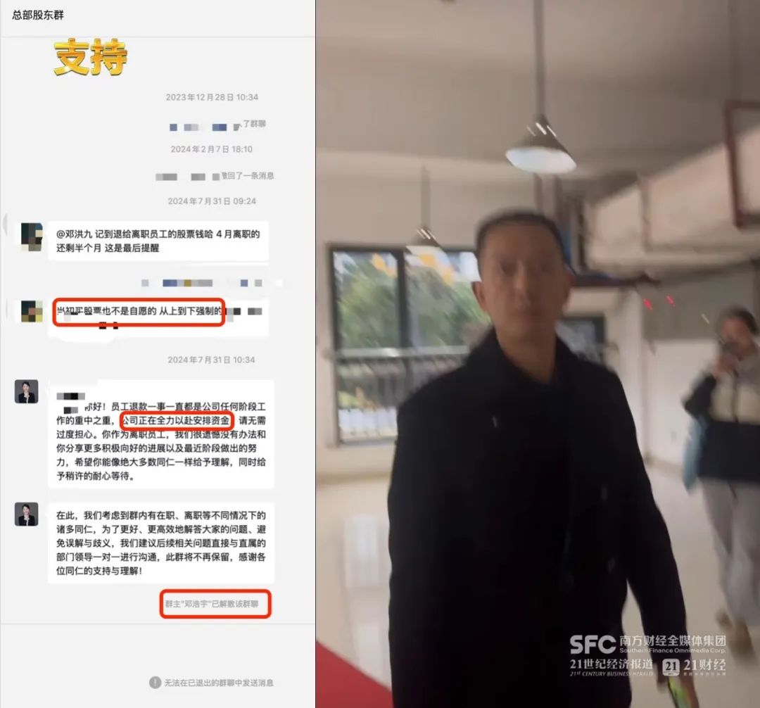 有被迫认购的员工于2024年7月在总部股东群里质问退款,邓浩宇回应正全力安排资金后,解散了群。