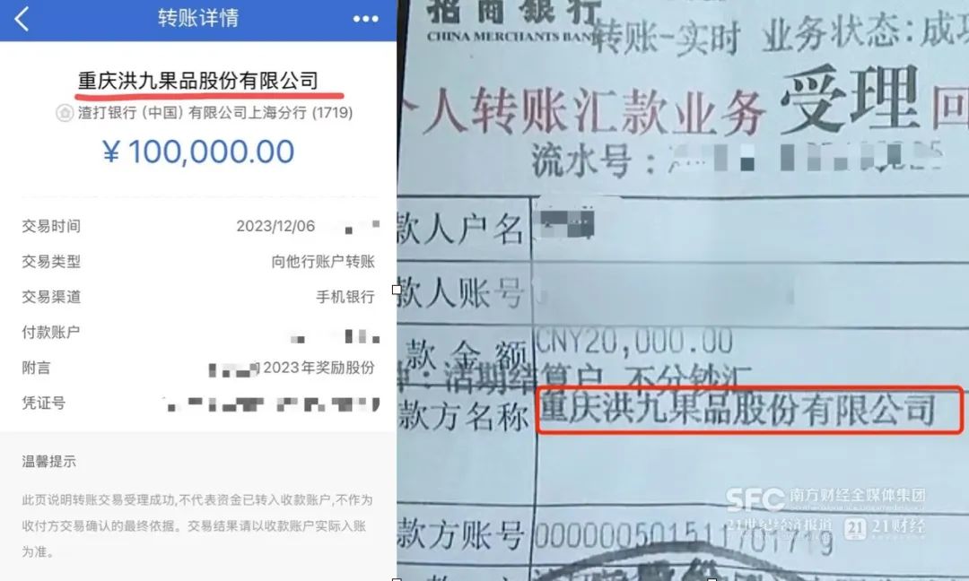 即便如此,这些打款也被照单全收。多位前员工出示的打款记录显示,这些钱都被打给了洪九果品指定的渣打银行专户。按照公司说法,这批钱将在2024年通过二级市场买入股票。