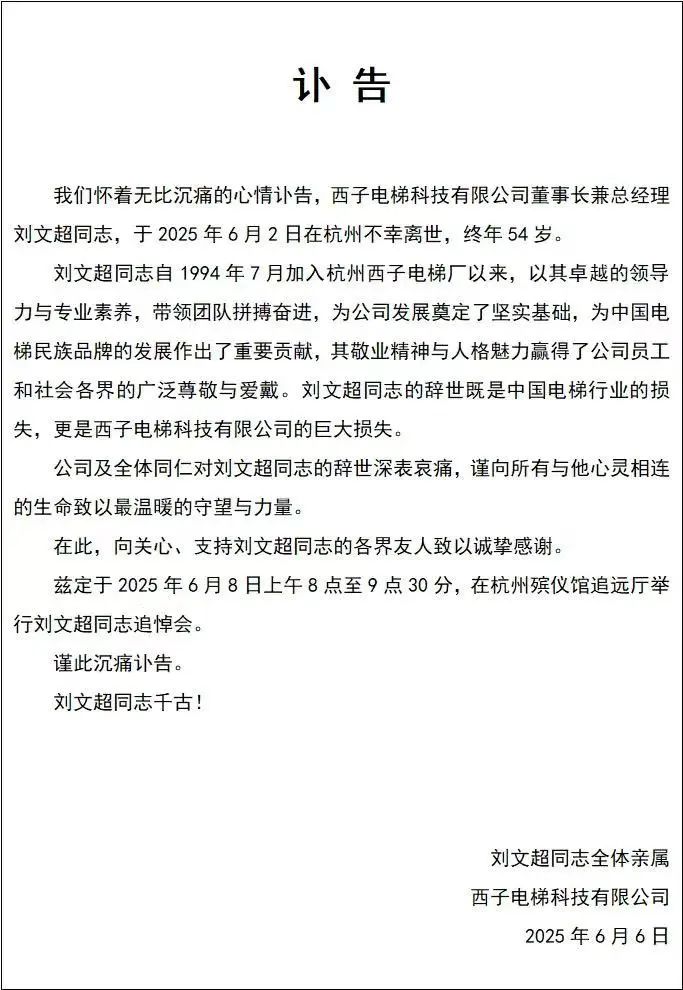 讣告称,刘文超同志自1994年7月加入杭州西子电梯厂以来,以其卓越的领导力与专业素养,带领团队拼搏奋进,为公司发展奠定了坚实基础,为中国电梯民族品牌的发展作出了重要贡献,其敬业精神与人格魅力赢得了公司员工和社会各界的广泛尊敬与爱戴。刘文超同志的辞世既是中国电梯行业的损失,更是西子电梯科技有限公司的巨大损失。