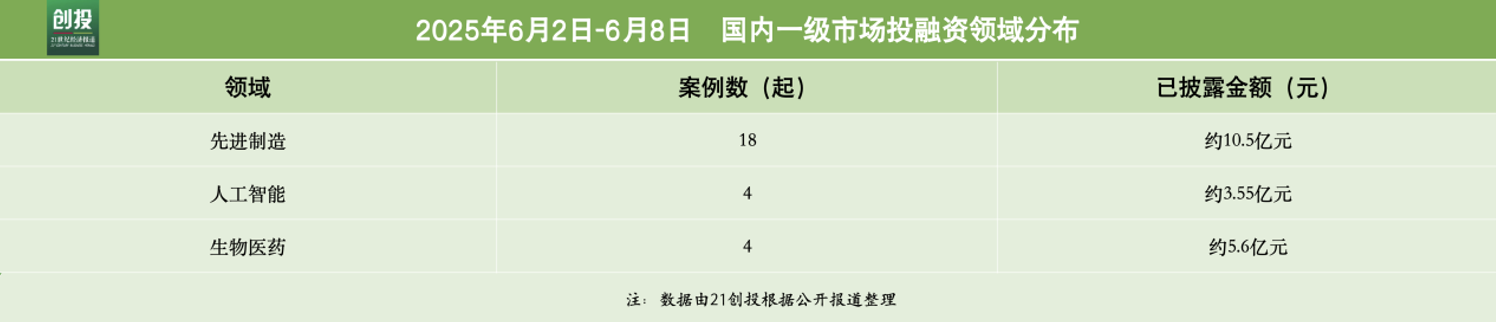 本周融资数量最多的依旧是科技与制造行业。在行业领域的诸多赛道中,先进制造完成18笔融资,披露融资额约10.5亿元人民币;人工智能赛道完成4笔融资,披露融资金额约3.55亿元人民币。在医疗健康领域,生物医药赛道完成4笔融资,披露融资金额约5.6亿元人民币。