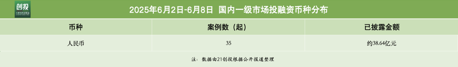 21创投不完全统计,6月2日—6月8日,报告日期内国内一级市场发生融资事件40起。其中,有35笔融资披露了融资金额和币种信息,总规模约人民币38.64亿元。
