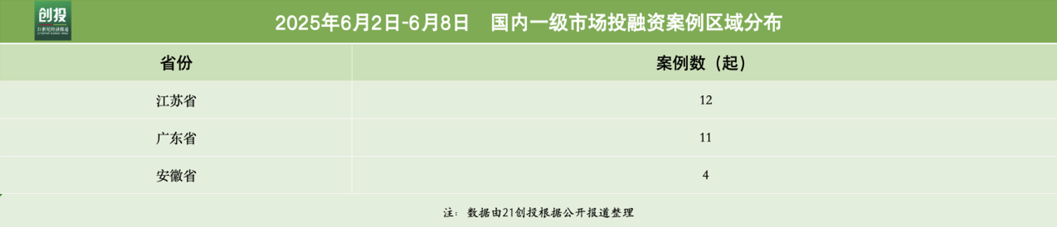 从披露获投企业的地域分布来看,本周的融资地区主要集中在江苏省、广东省和安徽省。江苏省完成12笔融资,广东省完成11笔融资,安徽省完成4笔融资。