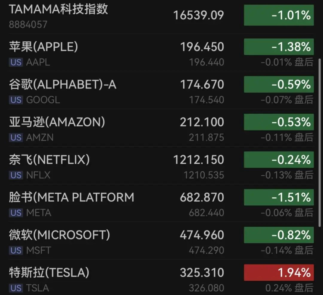 大型科技股多数下跌,英伟达跌逾2%,脸书跌逾1%,苹果跌逾1%,微软跌0.82%,谷歌跌0.59%,亚马逊跌0.53%,特斯拉涨逾1%。