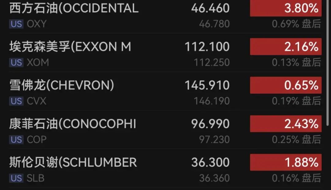 能源股集体上涨,埃克森美孚涨超2%,雪佛龙涨0.65%,康菲石油涨逾2%,斯伦贝谢涨近2%,西方石油涨逾3%。