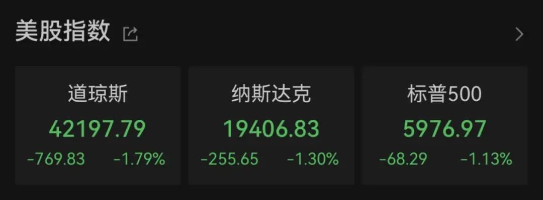 截至收盘,道指跌1.79%,报42197.79点,标普500指数跌1.13%,报5976.97点,纳指跌1.3%,报19406.83点。