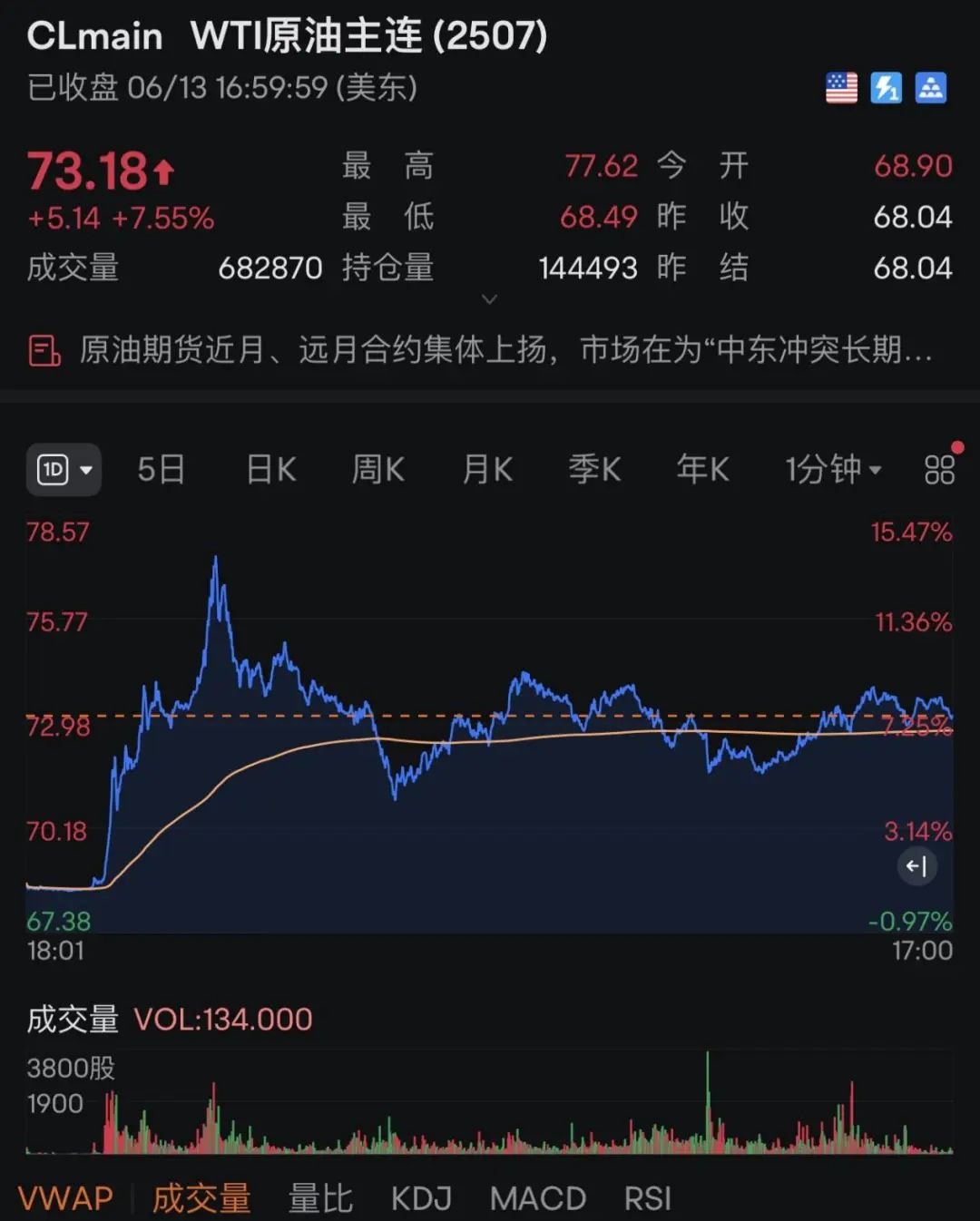 美东时间6月13日周五,美国三大股指全面下跌,以色列对伊朗发起空袭,随后遭到伊朗导弹反击,市场避险情绪激增,黄金、原油价格大幅上涨。